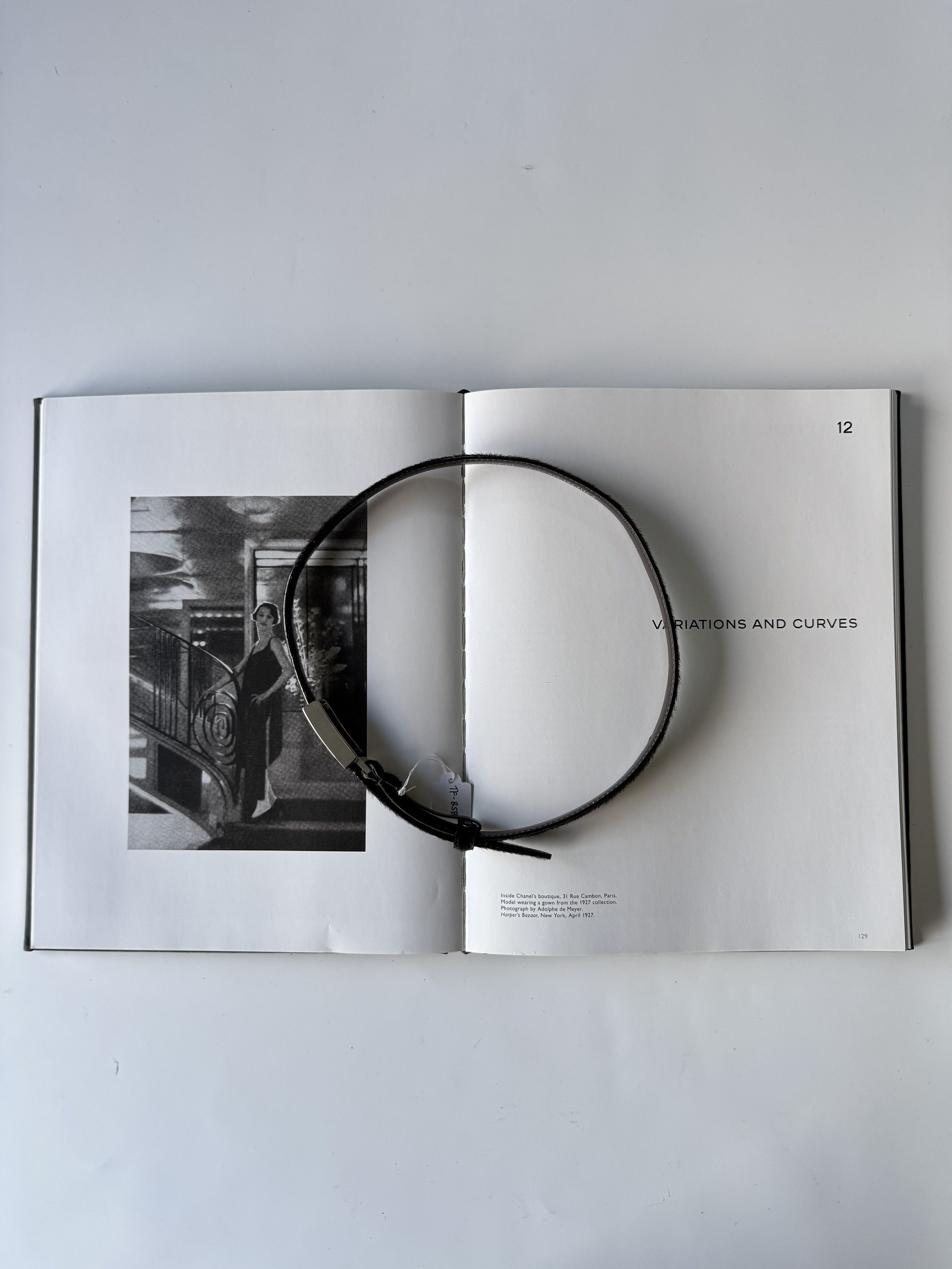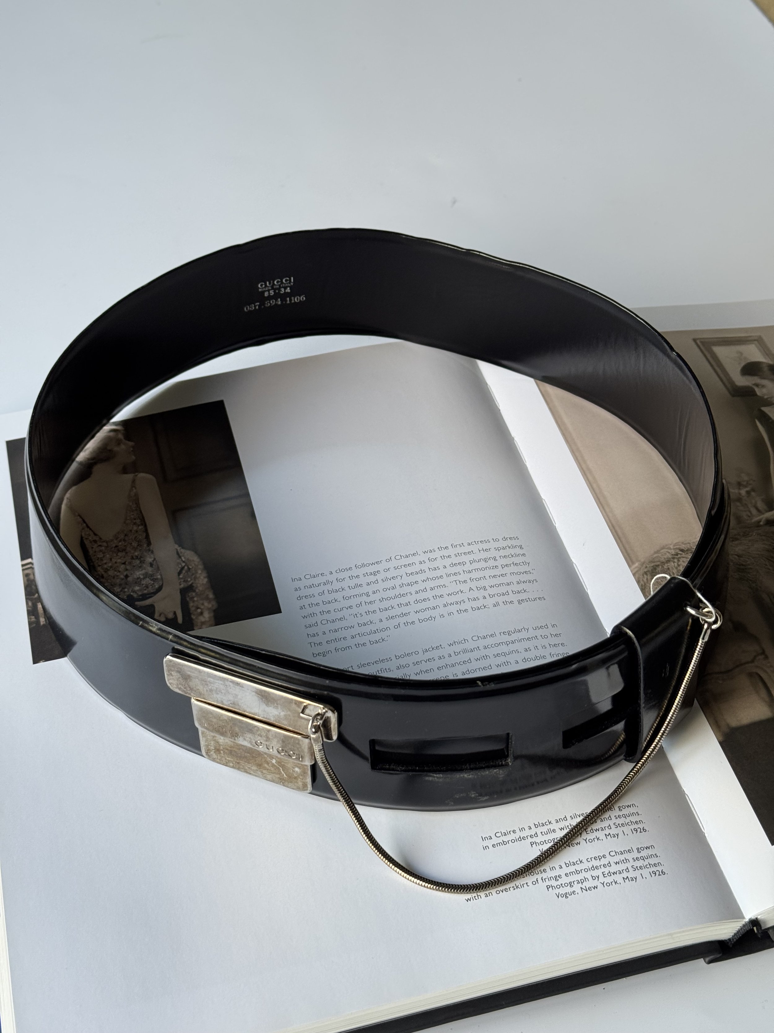 Black patent leather belt with silver horsebit hardware.