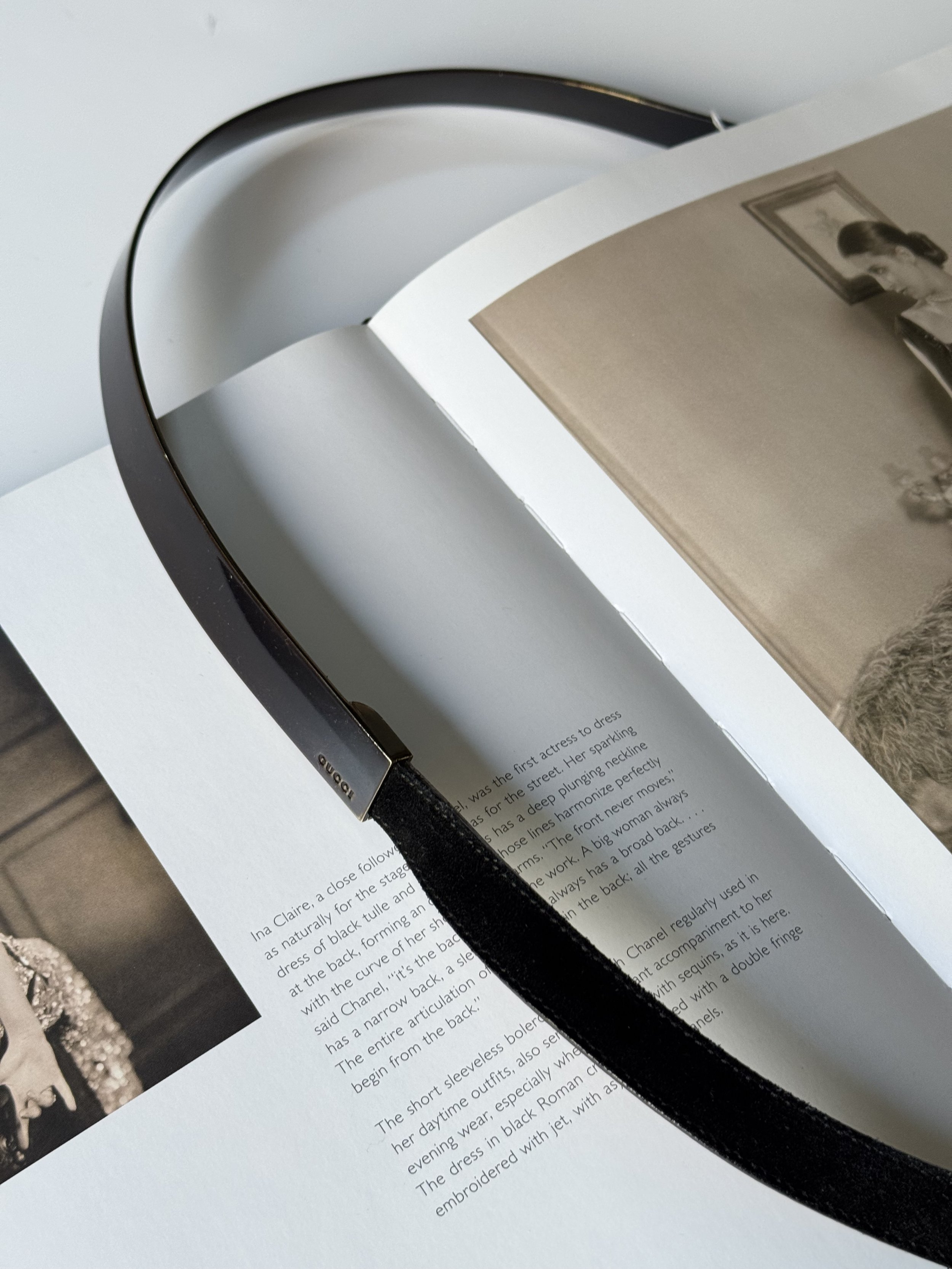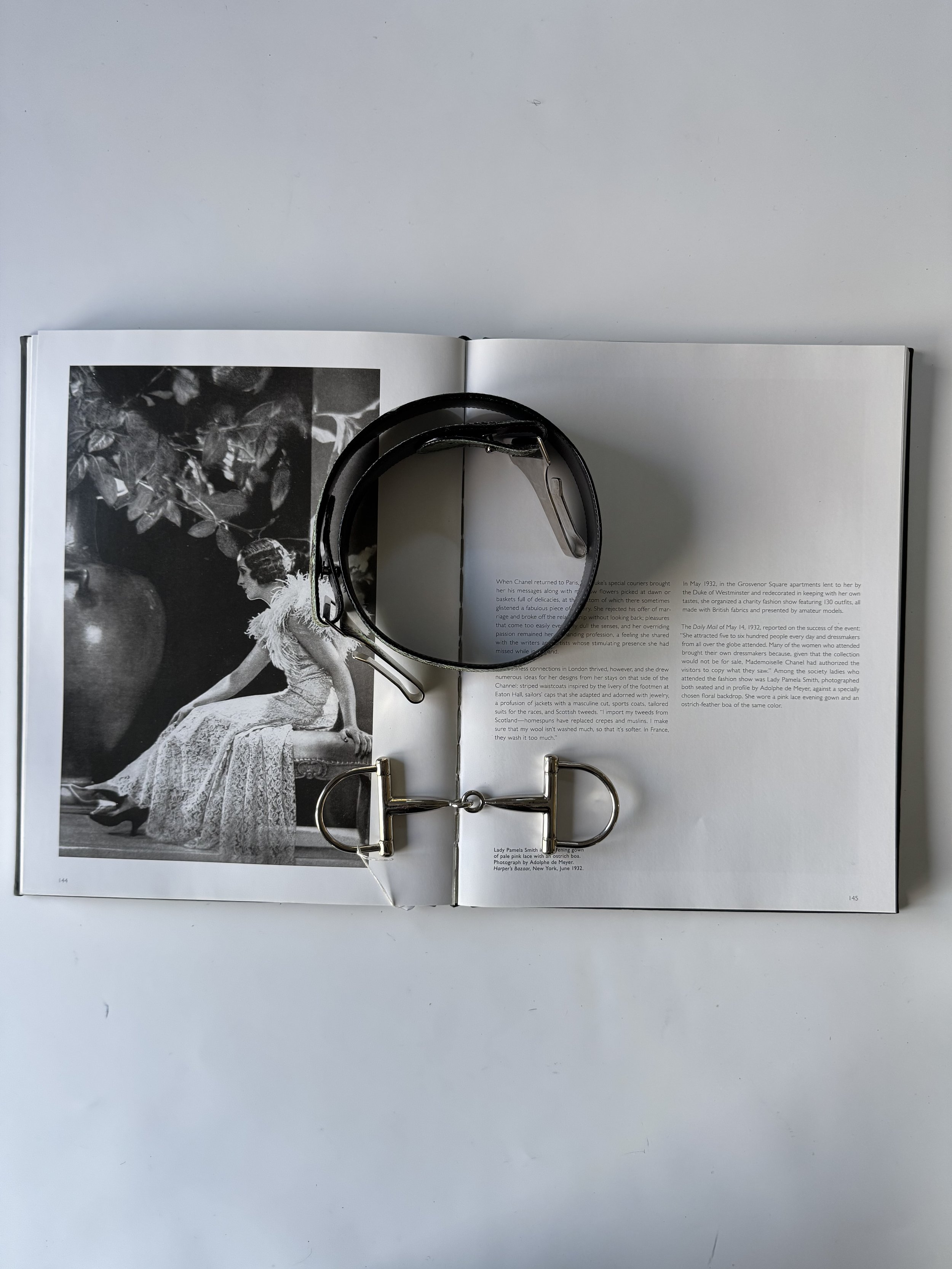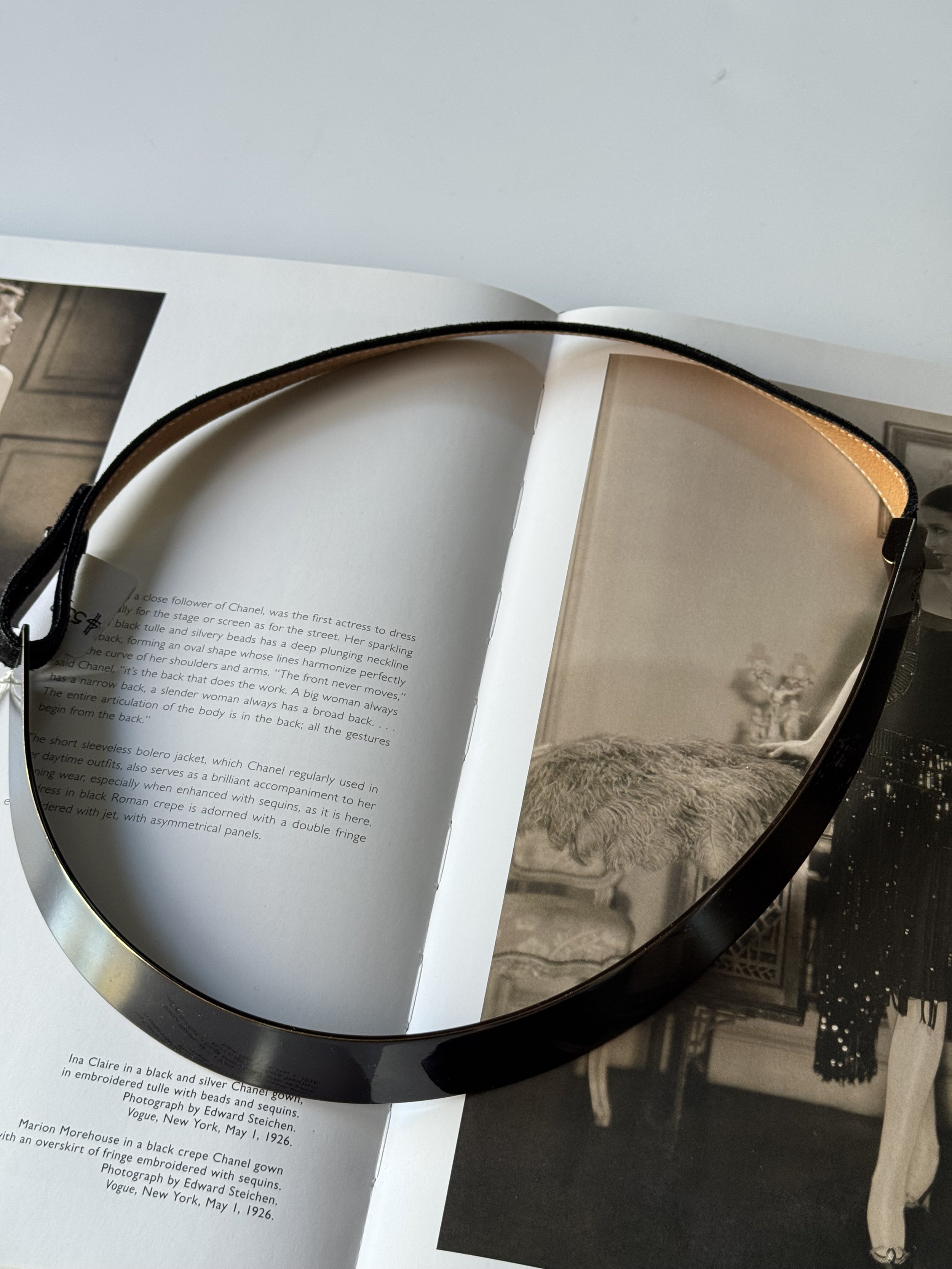 Black leather belt with silver chain hardware. Some tarnishing on hardware.