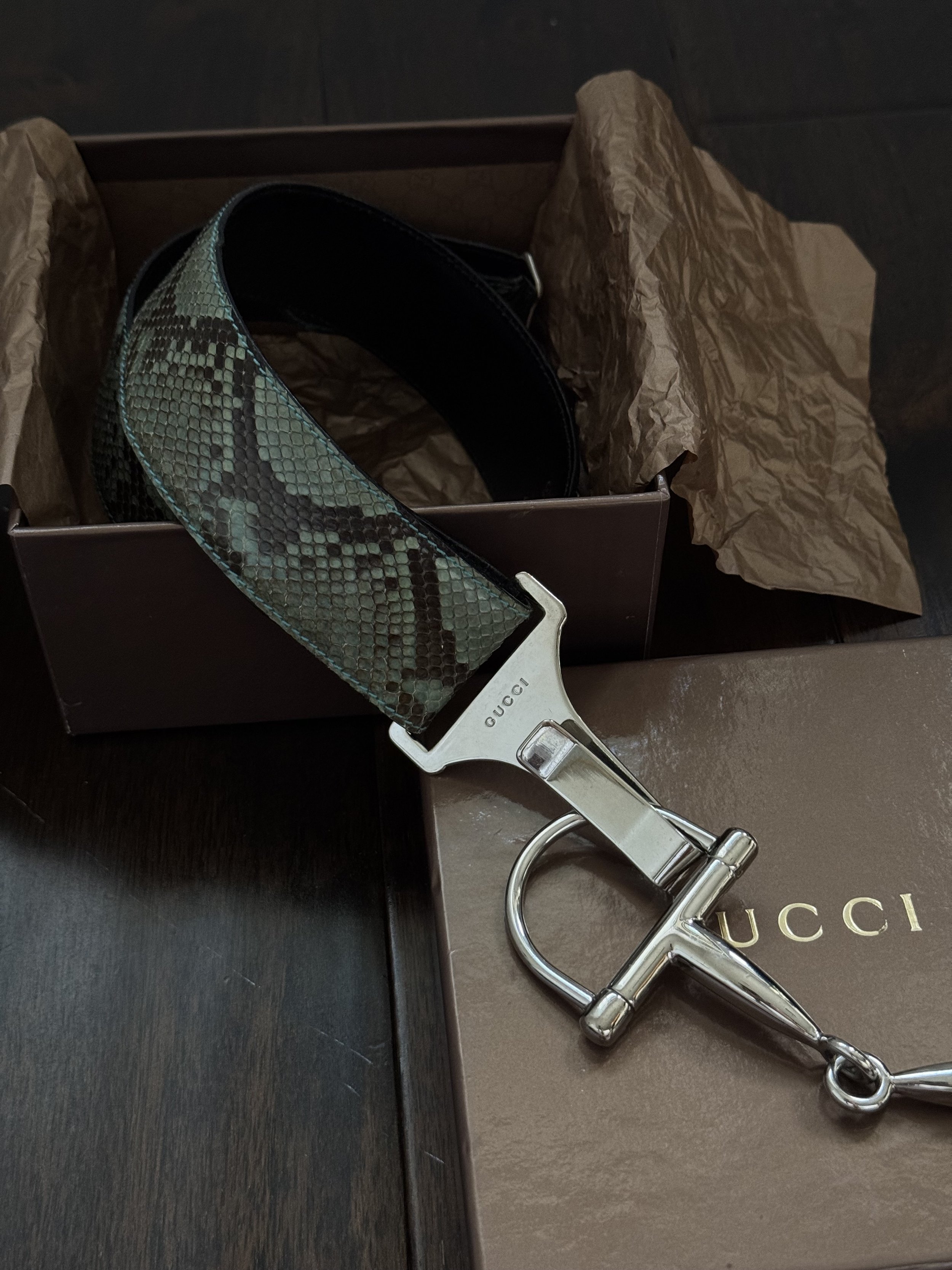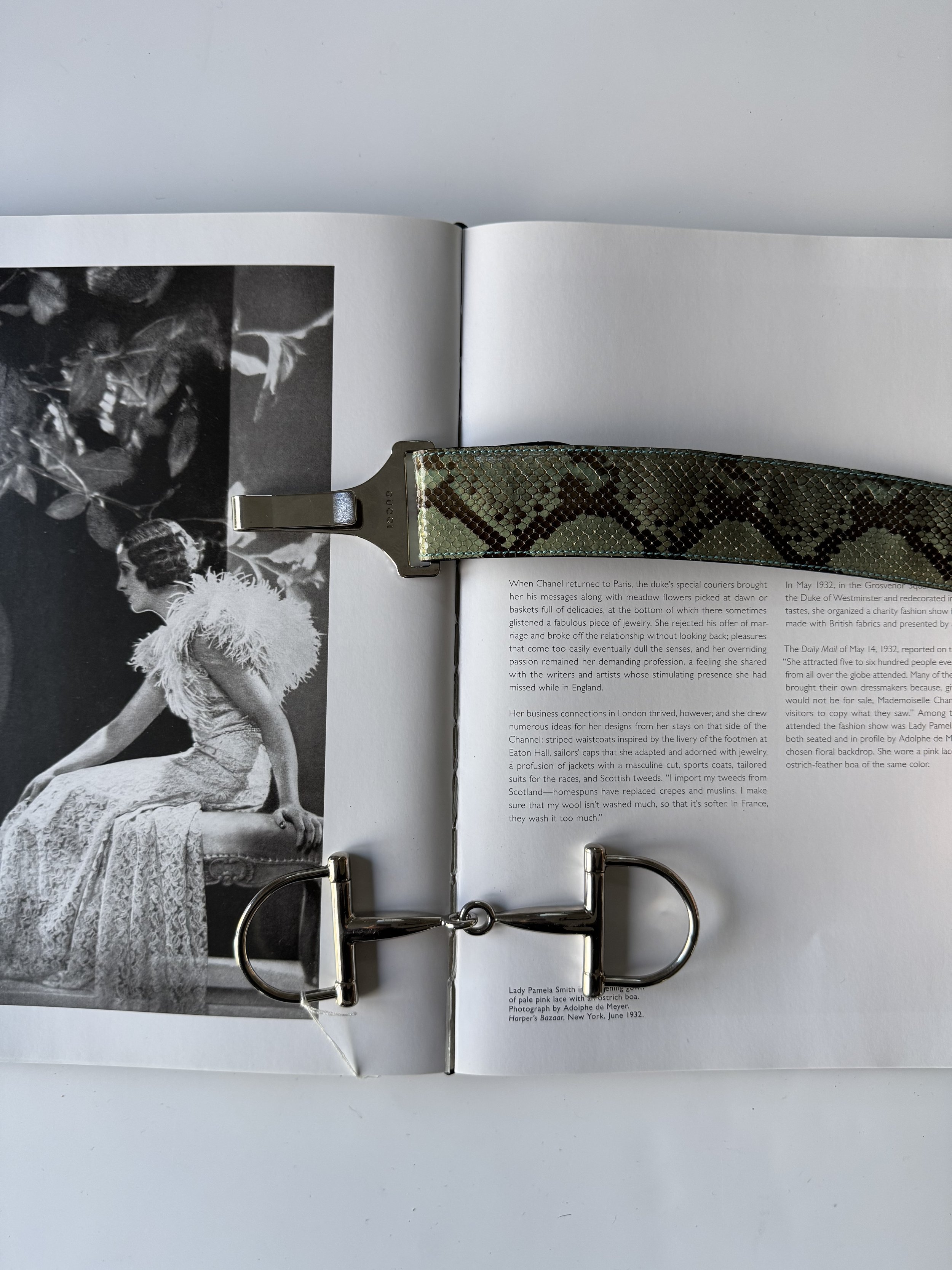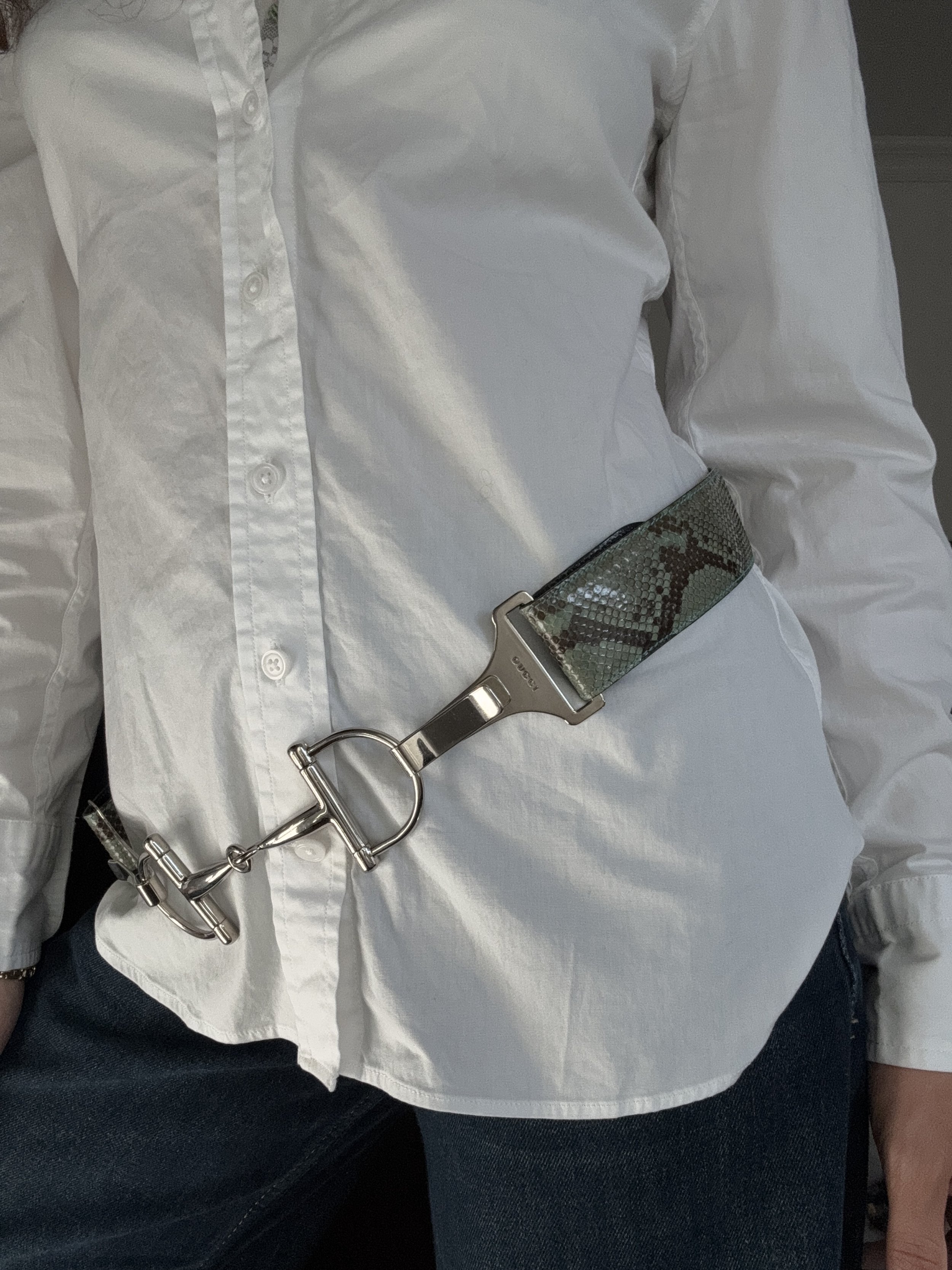 Black leather belt with silver chain hardware. Some tarnishing on hardware.