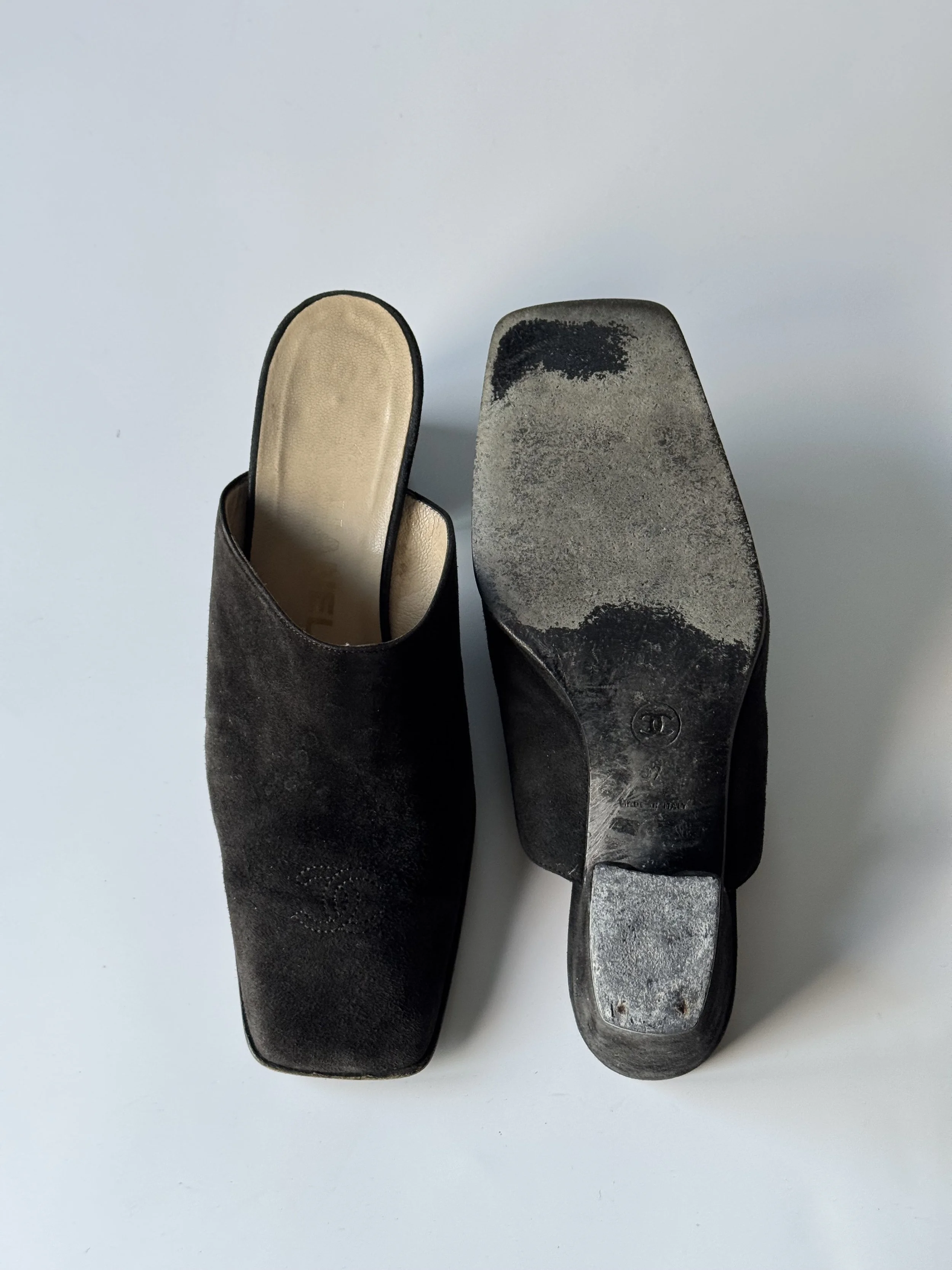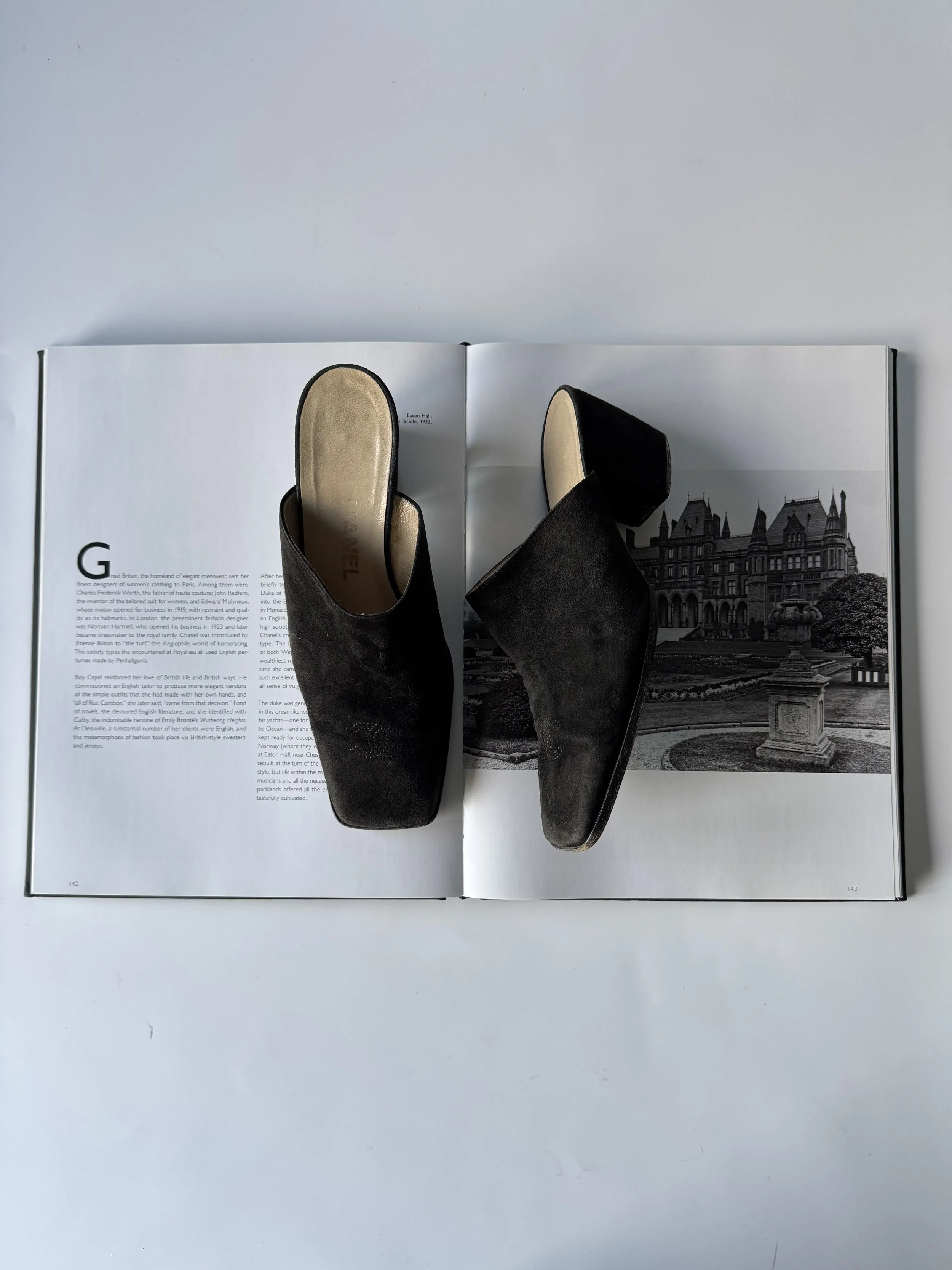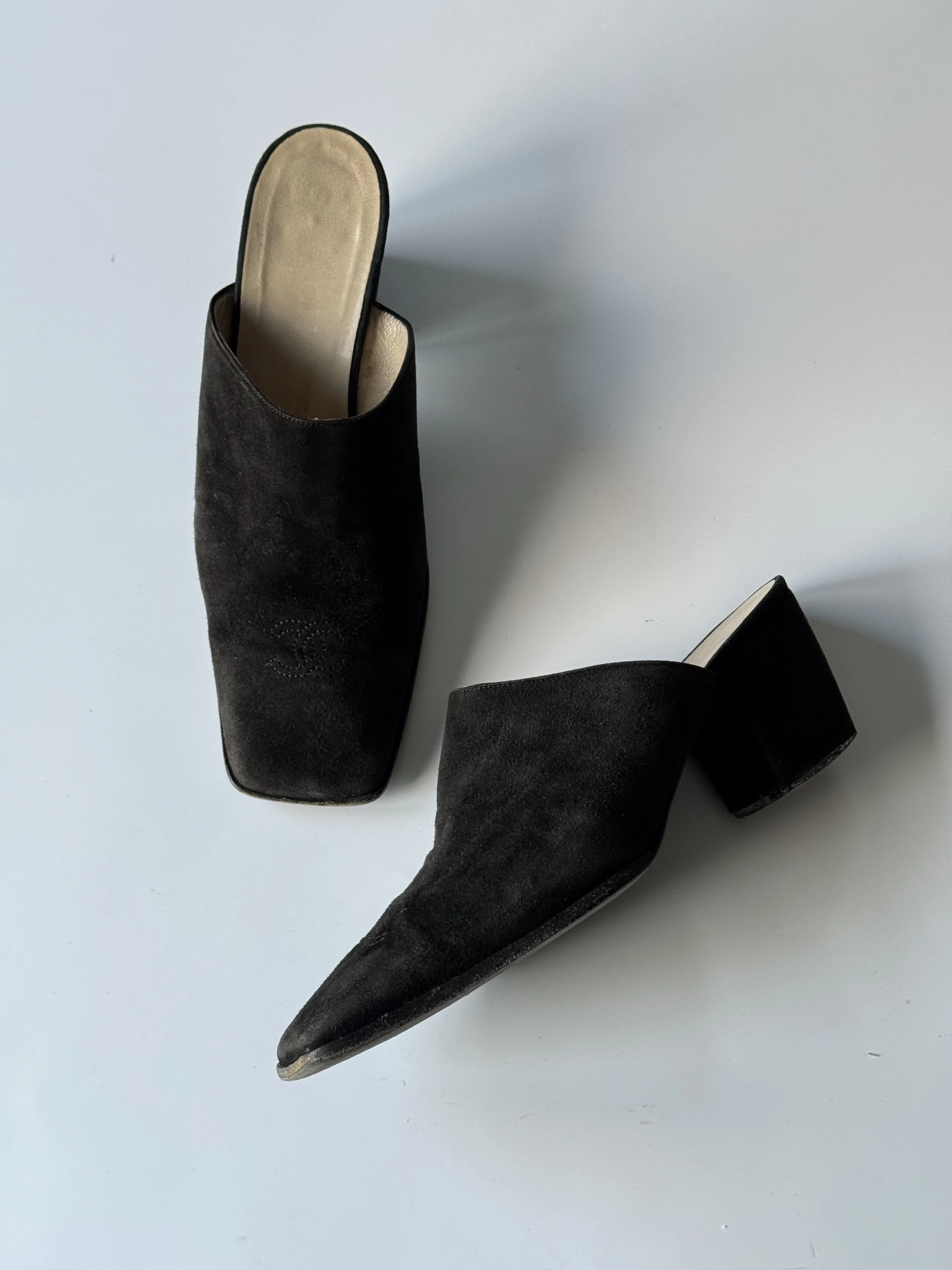 Vintage Manolo Blahnik black leather heels with pearl button details.