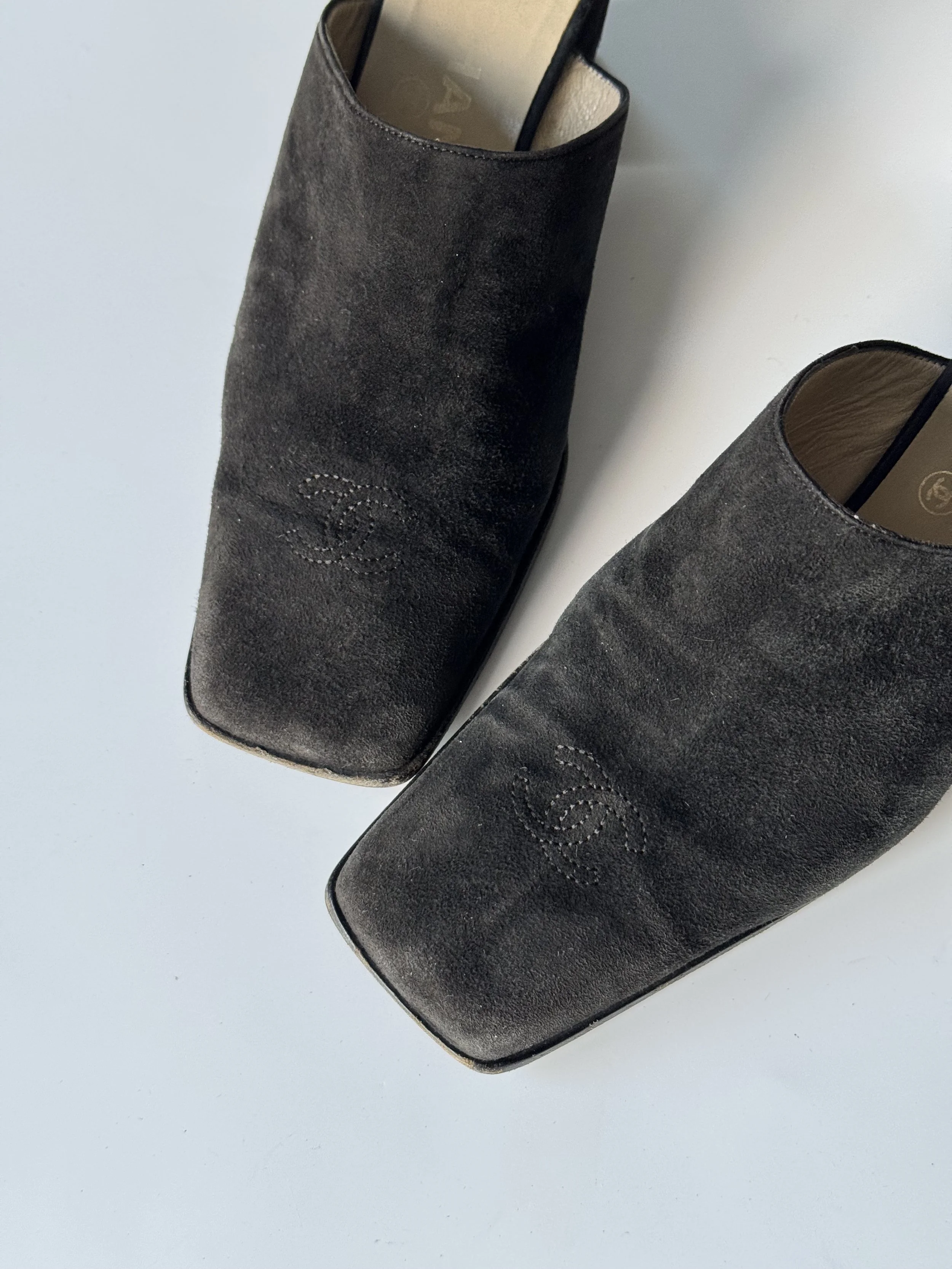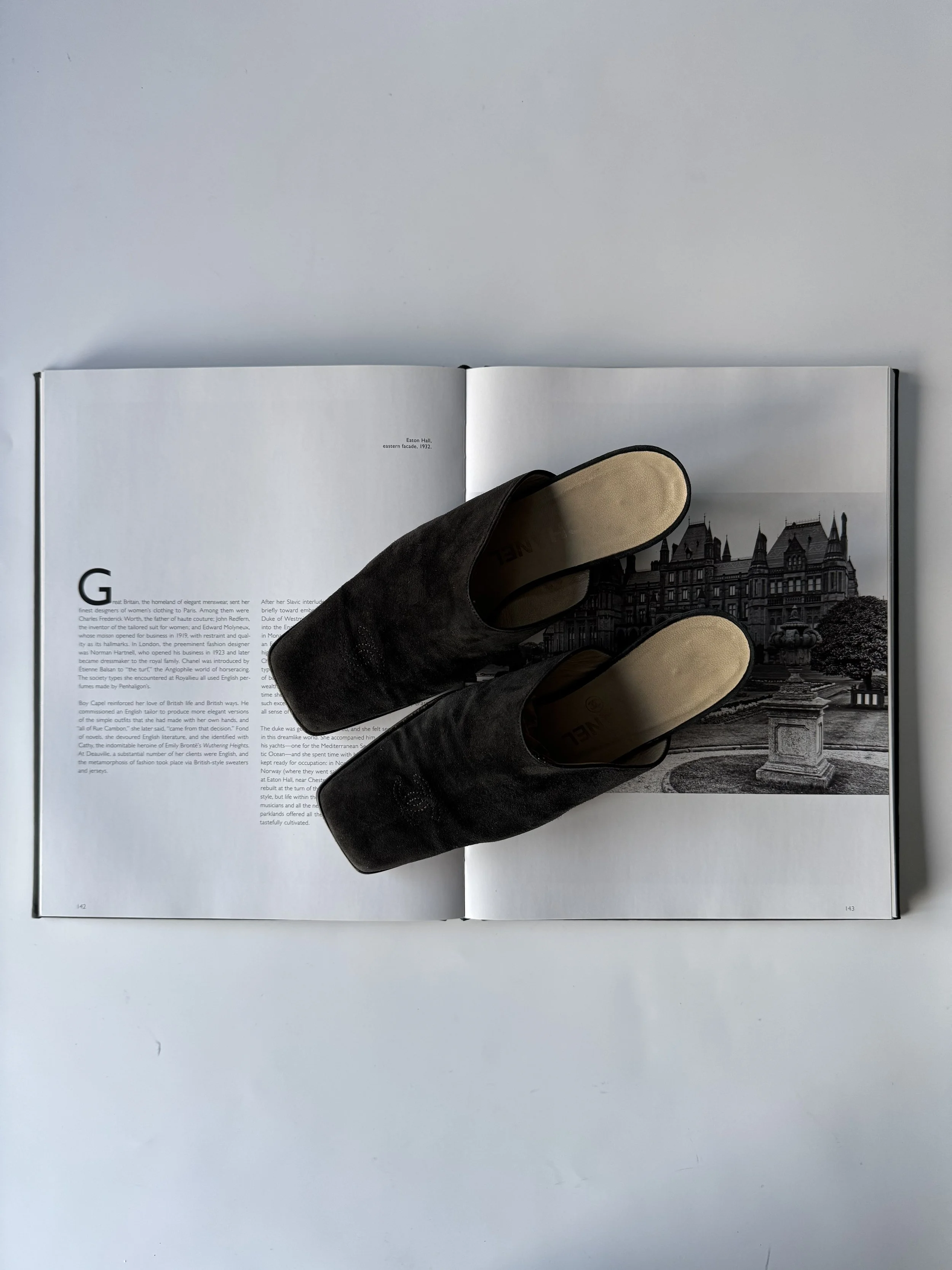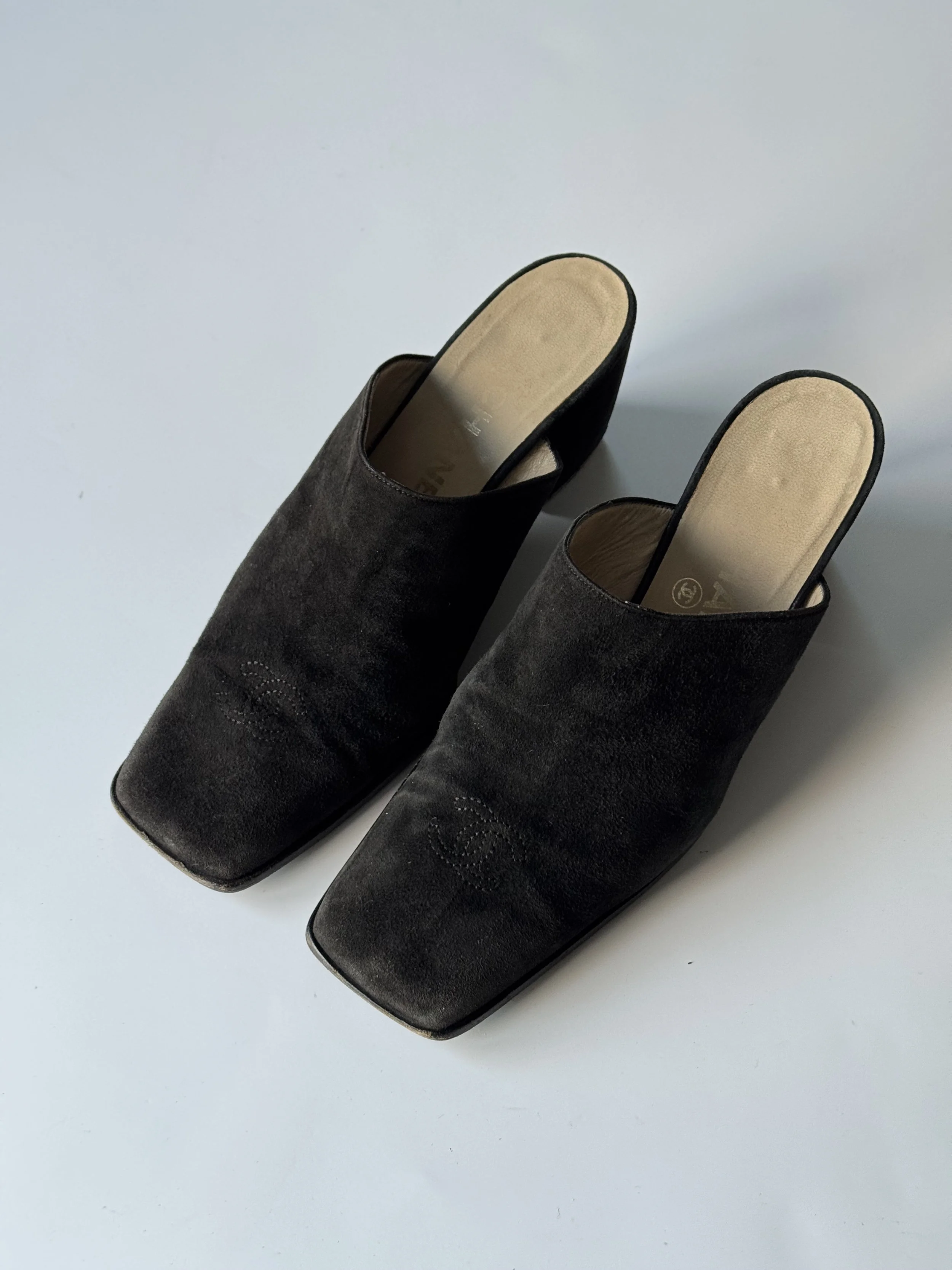Vintage Manolo Blahnik black leather heels with pearl button details.